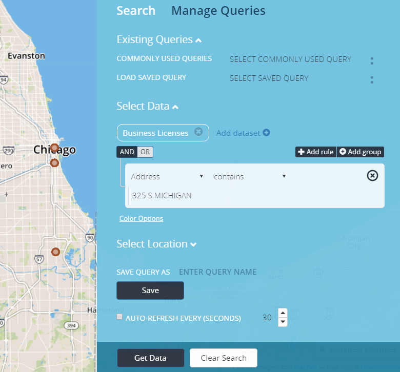 | 6. | Select Data, is a collapsible link that is used to run advanced searches within the find data panel. It has an "Add Dataset" link; that is used to start the process of creating a search, when selected it displays a droplist of available city datasets; when a dataset is selected an additional textbox appears with AND/OR operands with an additional droplist that displays the dataset searchable datatypes. There is also a color option link underneath the datatype selector search box, that provides the user with the option to change the data point color, size and transparency. |