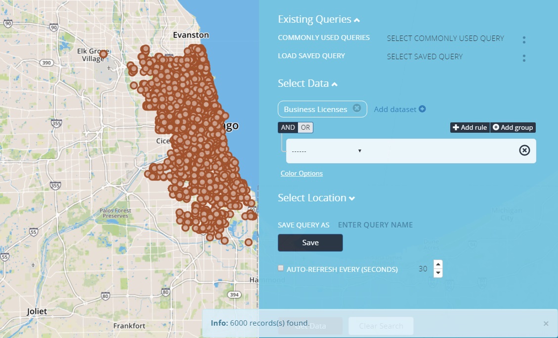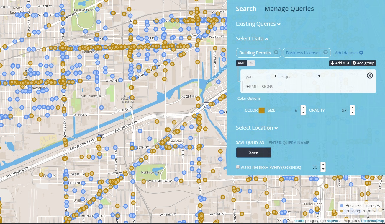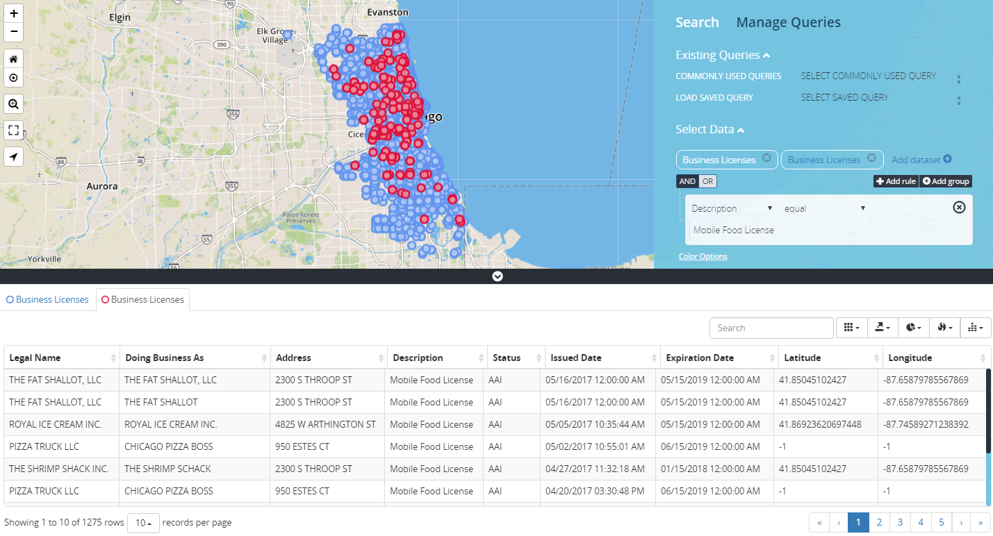 Query setup that returns multiple criteria from a dataset are used for comparison purposes. Using food establishments as an example, search restaurants and food trucks in Chicago. Both search descriptors are listed under a single dataset, called Business Licenses.